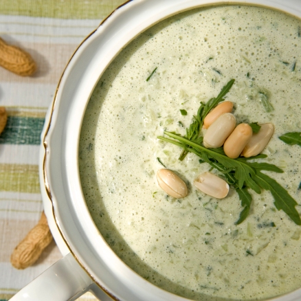 Dann den gehackten Knoblauch und die Erdnussbutter dazu geben. Noch kurz aufköcheln und die Sahne dazu geben, dann alles mit dem Pürierstab pürieren.