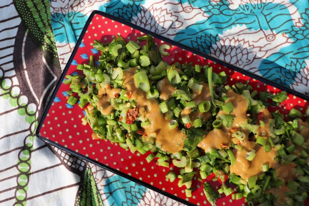 Das Dressing über den Sellerie geben und mit Frühlingszwiebeln garnieren. Dazu passt gegrilltes Fleisch oder gebratener Tofu.
