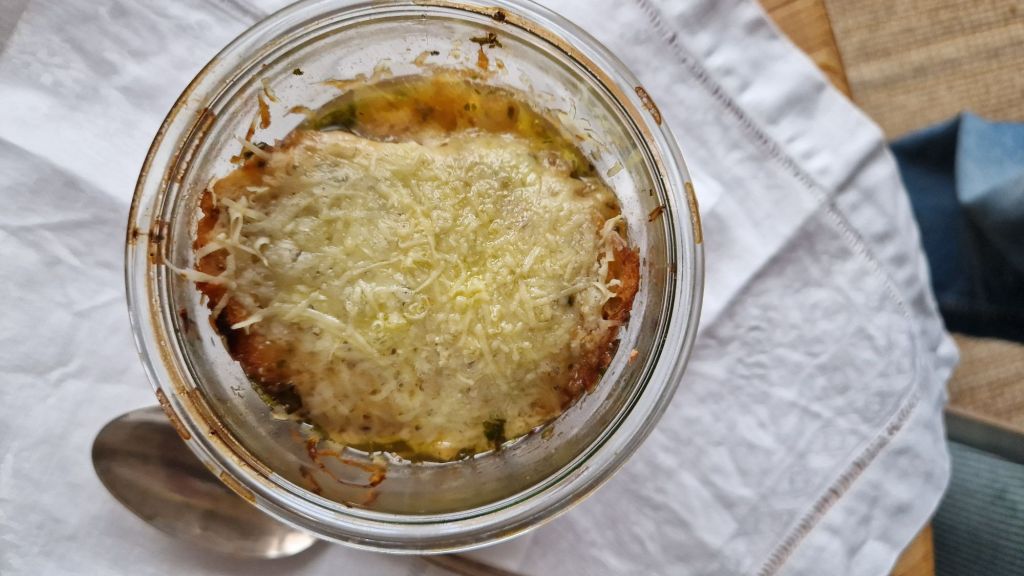 Französische Zwiebelsuppe und ich, das ist eine lebenslange Liebesgeschichte. Als ich noch sehr klein war, sind wir immer öfter in ein Restaurant in Steinheim gegangen. Es hieß Treppchen und alles auf der Karte war himmlisch… also, eigentlich weiß ich gar nicht so recht was sonst noch so alles auf der Karte war. Ich habe nämlich immer nur das Gleiche gegessen. Einen Salat (nicht irgendeinen Salat, den weltbesten Salat) mit gebackenem Camambert (einem echten Camembert, der dort paniert und in Butterschmalz ausgebacken wurde) und als Vorspeise gab es eben eine französische Zwiebelsuppe. Sie war schön pfeffrig, voller Zwiebeln und hat herrlich von innen gewärmt. Irgendwann war das Restaurant einfach zu, aber die Liebe zu dieser Suppe ist geblieben.