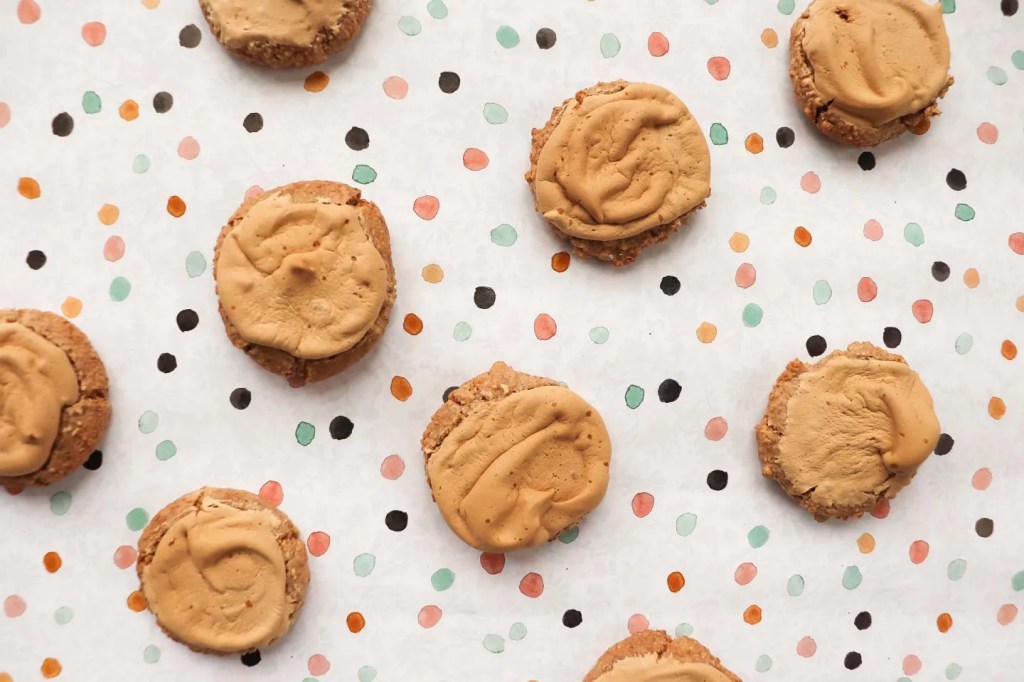 Das Eiweiß zusammen mit dem dunklen Muskovadozucker und dem Salz steif schlagen und mithilfe von 2 Teelöffeln auf den Plätzchen verstreichen.