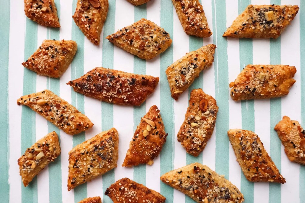 Es schmeckt raffinierter, als es herzustellen ist. Man braucht nur einen guten Hartkäse, Mehl, Butter, Salz, Milch und ein Haufen Zeug zum Bröseln. Das können gehackte Nüsse, Saaten, aber auch Trockenfrüchte oder Kräuter sein. Lecker sind auch Röstzwiebeln oder Gewürze wie Koriander oder Paprikapulver. Der Kreativität sind keine Grenzen gesetzt und jeder kann das nehmen, was ihm schmeckt (oder was wegmuss).